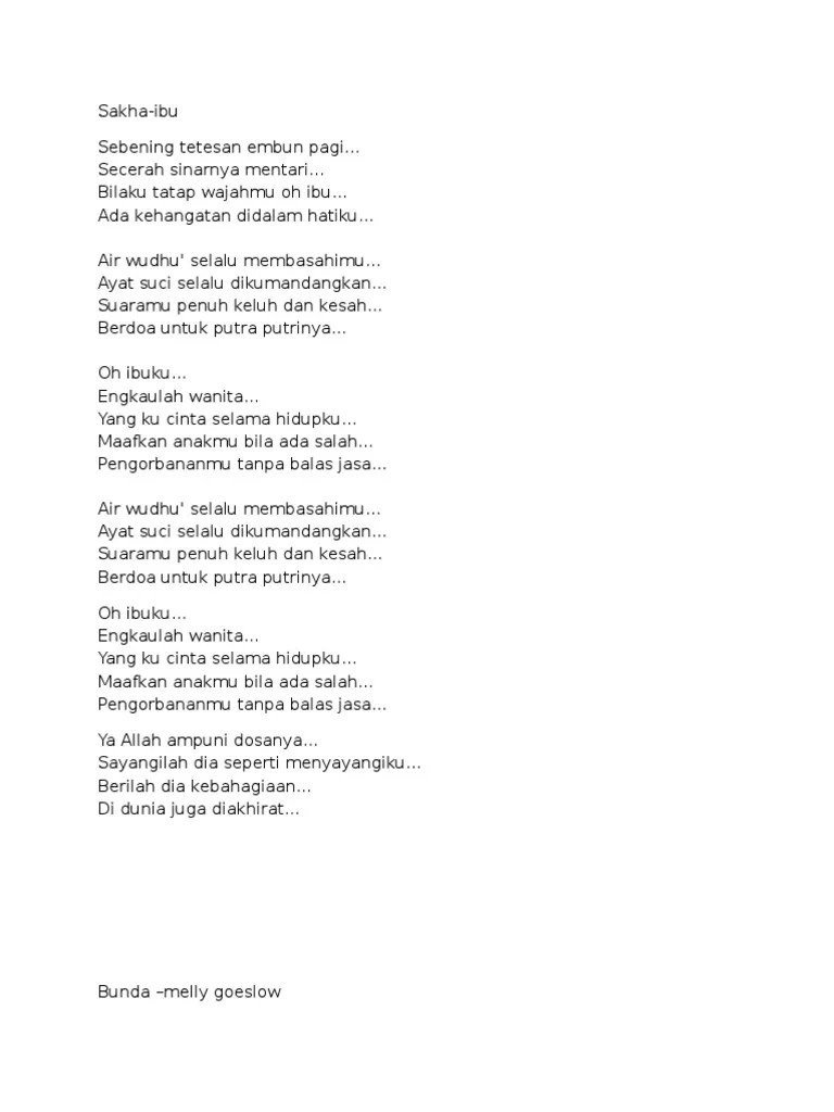 Yang ku cinta selama hidupku. Di dunia juga di akhirat. Yang ku cinta selama hidupku. Suara lembut penuh keluh dan kesah e am berdoa untuk putra putrinya chorus : Maafkan anakmu bila ada salah. Lirik lagu 'ibu' yang dipopulerkan sakha, oh ibuku engkaulah wanita. (chorus) oh ibuku… engkaulah wanita… yang ku cinta selama hidupku… maafkan anakmu bila ada salah… pengorbananmu tanpa balas jasa… ya allah ampuni. Maafkan anakmu bila ada salah. Yang ku cinta selama hidupku. Dm am maafkan anakmu bila ada salah. Am dm oh ibuku engkaulah wanita e am yang ku cinta selama hidupku E am pengorbananmu tanpa balas jasa. Maafkan anakmu bila ada salah.